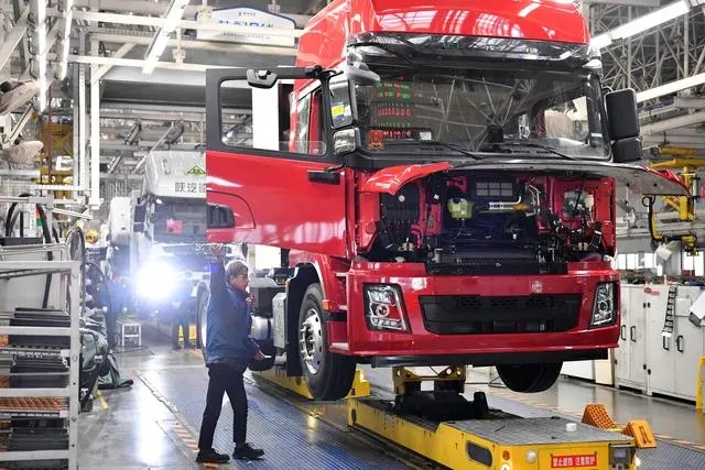 工業(yè)機器人揮舞長臂,工人在生產(chǎn)線上緊張忙碌。在位于西安經(jīng)開區(qū)涇渭新城的陜汽控股集團,總裝車間正馬力全開,每6分鐘就有一輛整車從這里下線。