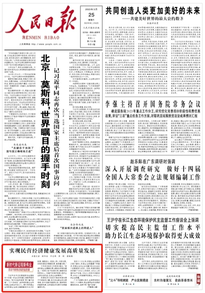 3月25日,《人民日報》頭版刊發(fā)文章《實現(xiàn)民營經(jīng)濟健康發(fā)展高質(zhì)量發(fā)展(新時代新征程新偉業(yè)·堅定不移推動高質(zhì)量發(fā)展)》,其中聚焦陜西民營經(jīng)濟發(fā)展。