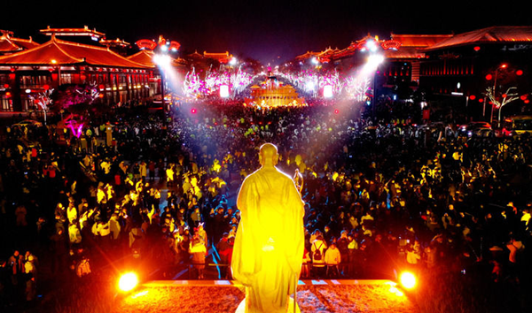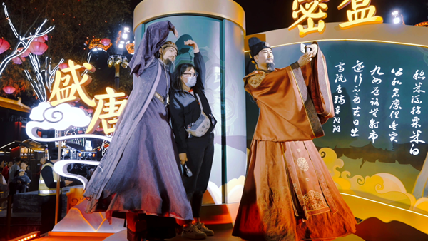 “《西游記》中九九八十一難,第一難是什么?”“不知道,不要緊,來,拍個照。”夜色漸濃,西安市大雁塔下的大唐不夜城華燈熠熠,流光溢彩。兩位身著古裝的演員,分別扮演唐代名人房玄齡和杜如晦,出題與游客進(jìn)行互動,幽默風(fēng)趣的提問和回答引得臺下觀眾不時(shí)發(fā)出陣陣歡笑。