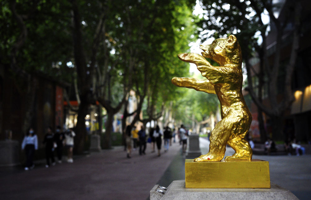 “電影圈子·西影電影產(chǎn)業(yè)集聚區(qū)”的“星光大道”中的“金熊獎”雕塑。新華社記者 劉瀟 攝