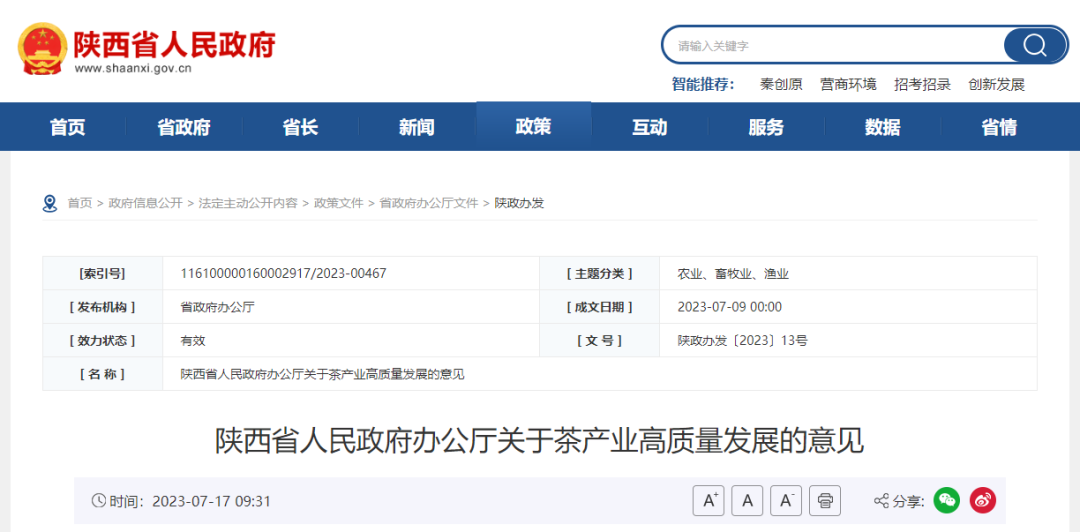 陜西省人民政府辦公廳關于茶產(chǎn)業(yè)高質(zhì)量發(fā)展的意見