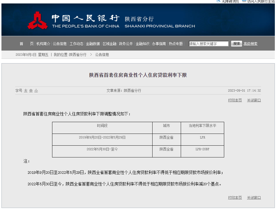 中國人民銀行陜西省分行注明,2019年9月20日至2022年5月29日,陜西全省首套商業(yè)性個人住房貸款利率不得低于相應(yīng)期限貸款市場報(bào)價利率;2022年5月30日至今,陜西全省首套商業(yè)性個人住房貸款利率不得低于相應(yīng)期限貸款市場報(bào)價利率減20個基點(diǎn)。