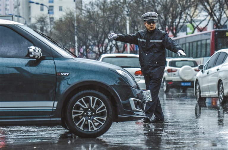 榆林市公安局交警支隊民警郭勇在雨中指揮交通(資料照片)。 受訪者供圖