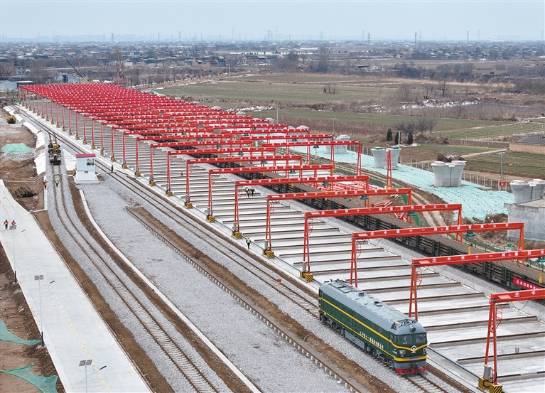 1月21日,中鐵十一局西延高鐵閻良鋪軌基地(無人機(jī)照片)。 當(dāng)日,隨著一列運(yùn)載500米長鋼軌的列車駛?cè)胫需F十一局西延高鐵閻良鋪軌基地,西(安)延(安)高鐵進(jìn)入存軌施工階段,為后續(xù)鋪軌工作奠定基礎(chǔ)。項(xiàng)目建成后,西安至延安的運(yùn)行時(shí)間將從目前的2.5小時(shí)縮短至1小時(shí)左右。 新華社記者 張博文攝
