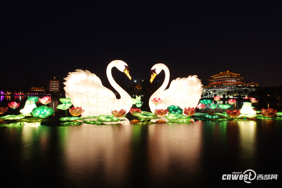 這兩只高達(dá)5.5米的巨型“天鵝”,是本屆燈會主打的彩燈之一。西部網(wǎng)訊(記者 魏永賢 敬澤昊)2月4日晚,西北地區(qū)最大的水陸燈會在大唐芙蓉園舉行點(diǎn)燈儀式,上百盞……
