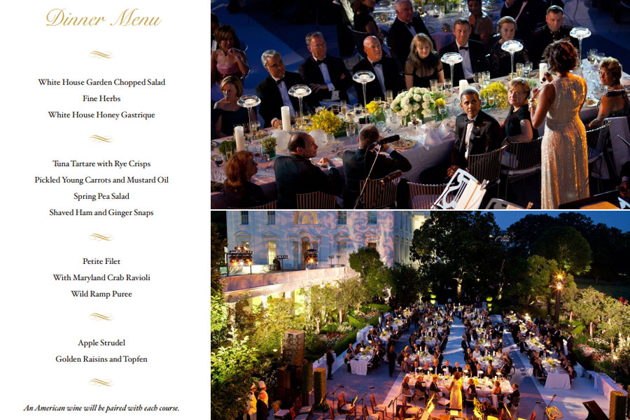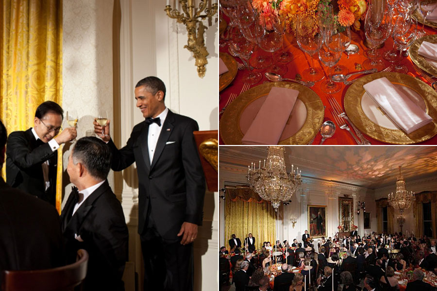 美國白宮2011年10月13日迎來了韓國總統(tǒng)李明博的訪問。當天晚上,奧巴馬設國宴款待李明博。白宮官網(wǎng)在介紹國宴菜品時說,當晚的菜品是當?shù)刈詈玫氖巢暮晚n國傳統(tǒng)風味結合的成果。