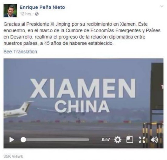 墨西哥總統(tǒng)培尼亞參加了5日召開的新興市場國家與發(fā)展中國家對話會,商討“金磚+”合作。他在臉譜賬號上發(fā)文說:“感謝習近平主席在廈門的款待。在新興市場國家與發(fā)展中國家對話會期間(與習主席)的會晤,在(墨中)建交45周年之際,加深了我們兩國之間的外交關(guān)系。”