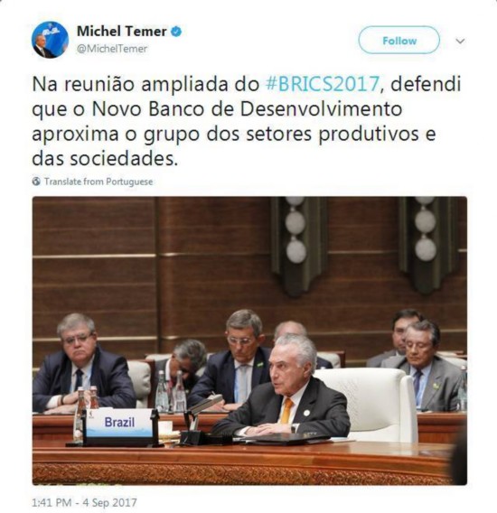 在廈門期間,巴西總統(tǒng)特梅爾在其推特認證賬號上共發(fā)布了30多條有關(guān)此次會晤的推文,是當之無愧的“社交媒體達人”。
