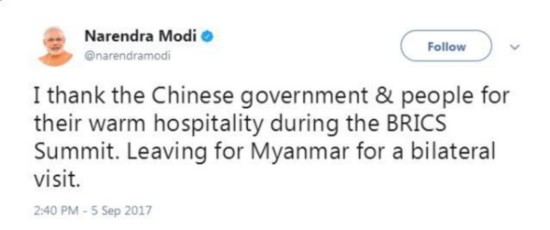 廈門會晤期間,印度總理莫迪關(guān)于“金磚”發(fā)了至少15條推文。會晤一結(jié)束,莫迪連發(fā)6條推文,介紹參會成果,其中3條是這么說的: