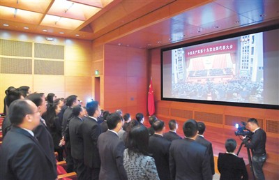 | 圖為當?shù)貢r間10月17日晚,中國駐美國大使館全館人員在館內(nèi)放映廳屏幕前觀看十九大開幕式。 |