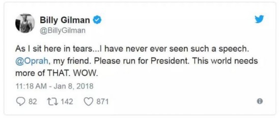 Billy Gilman:我現(xiàn)在坐在這兒淚流滿面……我從來(lái)沒(méi)聽(tīng)過(guò)這樣的演講,奧普拉,我的朋友,請(qǐng)競(jìng)選總統(tǒng)吧,這個(gè)世界需要更多這樣的聲音。