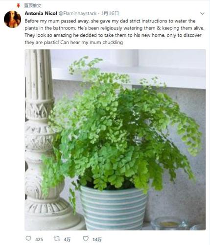英國女消防員尼科爾近日在推特上發(fā)文寫道:“家母離世前曾留下嚴(yán)格指示,要我爸爸為浴室內(nèi)的植物澆水。他定期澆水灌溉,它們很漂亮,他搬家時(shí)決定一起帶走,卻發(fā)現(xiàn)它們是塑料的!我彷佛聽到媽媽正在咯咯地笑!