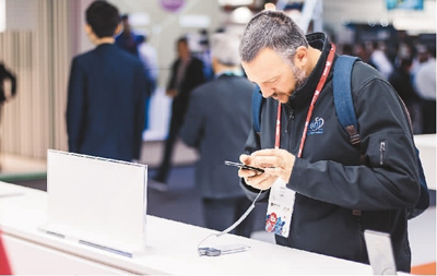 | 2月26日,2018年世界移動通信大會在西班牙巴塞羅那會展中心開幕。圖為國外參會者在中國手機品牌小米的展臺前參觀體驗。智 淵攝 |