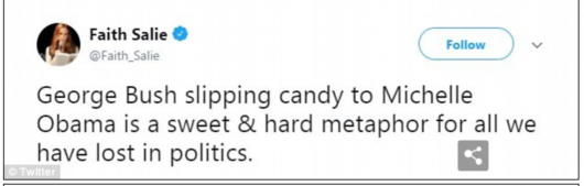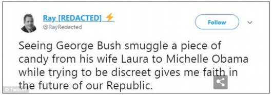 “看到小布什從妻子手中接過(guò)糖果給米歇爾,同時(shí)又試圖保持謹(jǐn)慎,讓我對(duì)共和黨的未來(lái)充滿希望!