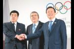 圖為1月20日,韓國代表團團長都鐘煥(右)和朝鮮代表團團長金一國在國際奧委會主席巴赫(中)主持的歡迎儀式上握手!