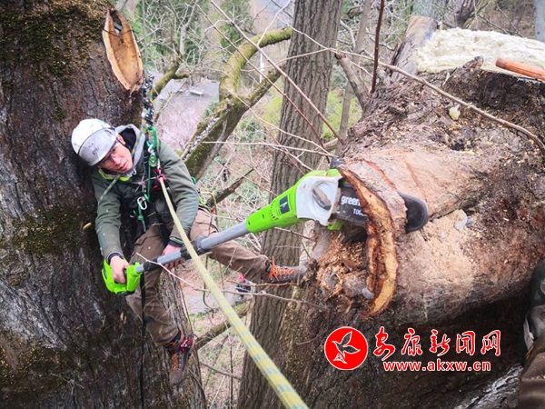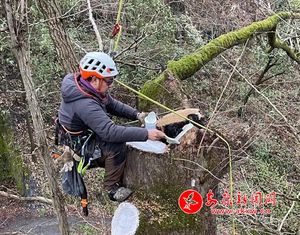 “在修復(fù)期間,我們聘請(qǐng)了國內(nèi)最頂尖的攀樹師、修剪師,攀登到樹頂,對(duì)樹體的枯枝、病腐枝進(jìn)行了清理,然后對(duì)所有樹洞存在腐爛的地方,使用消毒滅菌的藥物進(jìn)行處理,對(duì)影響樹體生長,可能造成二次傷害位置的漏洞、樹洞進(jìn)行了封堵。我們使用的攀樹、修剪技術(shù)目前在我們陜西省內(nèi)屬于首次的應(yīng)用,通過這次修剪之后讓陽光照進(jìn)傷口,使古樹再次萌發(fā)了蓬勃生長的動(dòng)力”,白河縣林業(yè)局自然保護(hù)地管理辦公室主任肖培軍介紹說。