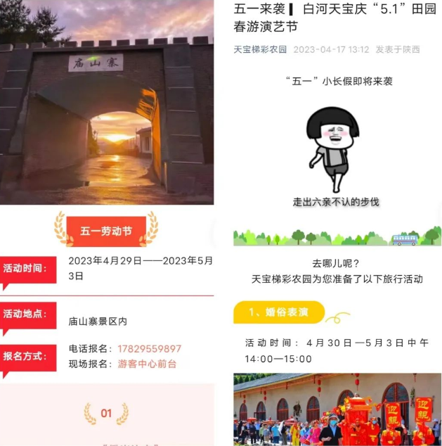 景區(qū)景點(diǎn)開放到位。“五一”期間,3家A級景區(qū)景點(diǎn)全部正常開放。其中天寶4A景區(qū)從4月29日至5月3日籌備舉辦田園春游演藝節(jié)系列活動(dòng),推出門票七折優(yōu)惠措施;廟山寨3A景區(qū)將舉辦“廟山”好聲音、攀巖比賽等節(jié)慶活動(dòng),推出138元游玩通票打五折、門票+餐飲立減等優(yōu)惠措施。