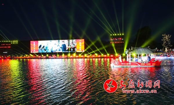 晚會(huì)在嘹亮激昂的獨(dú)唱《東方紅》中拉開序幕,緊接著,磅礴大氣的歌舞串燒《我和我的祖國》《萬疆》《愛我中華》,如詩如畫的水上表演《南湖紅船》《江南水鄉(xiāng)》《滾滾長江東逝水》,動(dòng)力澎湃的RAP時(shí)尚秀《門戶新安康》,美輪美奐歌舞表演《我的深情為你守候》《為祖國干杯》《送你一個(gè)長安》《我愛你,中國》《領(lǐng)航》等節(jié)目相繼登臺(tái)表演,與此同時(shí),絢麗多彩的燈光秀和仙氣飄飄的霧森特效穿插其中,不斷將演出推向高潮。最后,整場(chǎng)演出在大合唱《沒有共產(chǎn)黨就沒有新中國》的歌聲中圓滿落下帷幕。