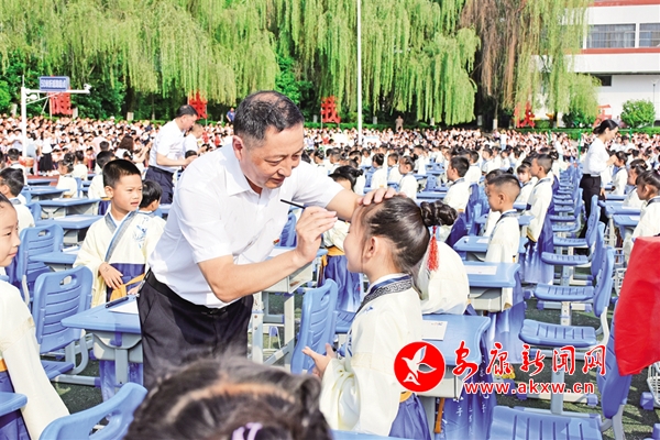 為傳承中國(guó)傳統(tǒng)文化,進(jìn)一步加強(qiáng)學(xué)生文明禮儀教育,日前,安康高新區(qū)第一小學(xué)舉行一年級(jí)新生開(kāi)筆禮及優(yōu)秀學(xué)生表彰活動(dòng)。千名一年級(jí)蒙童身著漢服,由班主任帶領(lǐng)跨過(guò)啟蒙門,正衣冠、感恩鞠躬、朱砂啟智、擊鼓明志、開(kāi)筆啟蒙,接受中國(guó)傳統(tǒng)文化的洗禮,領(lǐng)略傳統(tǒng)文化的魅力。(張凌云 攝)26y安康新聞網(wǎng)