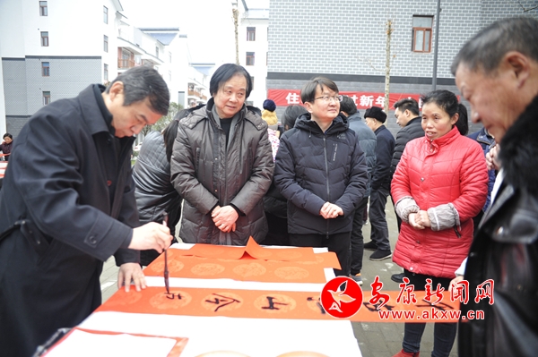 座談結(jié)束后,郭線廬一行在該鎮(zhèn)社區(qū)廣場開展了春聯(lián)義寫活動,F(xiàn)場創(chuàng)作書畫作品免費(fèi)贈予群眾,來自省、市、區(qū)的書畫家們飽含激情,現(xiàn)場揮毫潑墨,把一個個“福”字、一副副對聯(lián)、一張張精心創(chuàng)作的書畫作品送到群眾的手中,受到了周邊群眾的歡迎。