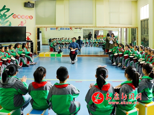 “同學(xué)們好,經(jīng)過前面的學(xué)習(xí),大家已經(jīng)熟練地掌握了非洲鼓低音和中音的打法,今天我們一起來學(xué)習(xí)高音的打法,打高音時(shí)手指自然張開,但不要張的很大,在打擊時(shí)要······”10月14日下午16:20,漢濱區(qū)果園小學(xué)非洲鼓社團(tuán)汪倩老師正在教學(xué)生非洲鼓演奏,孩子們熱情專注地拍打,富有節(jié)奏感的鼓聲飄蕩在校園上空。這是該校落實(shí)“5+2”模式素質(zhì)拓展服務(wù)的一個(gè)縮影。