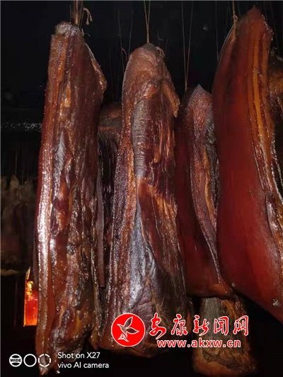 曹祖康的臘肉熏房是經(jīng)過(guò)特殊設(shè)計(jì)修建的,非常環(huán)保,熏制臘肉用的是青岡木和鋸末,這樣熏出來(lái)的臘肉香味濃,夏季沒(méi)有蚊蟲(chóng)叮咬,即使三伏天也不會(huì)變質(zhì)。經(jīng)過(guò)熏制后,取下燒皮,用熱水洗干凈,掛在庫(kù)房里晾干,經(jīng)過(guò)這些工序,臘肉就做成了。
