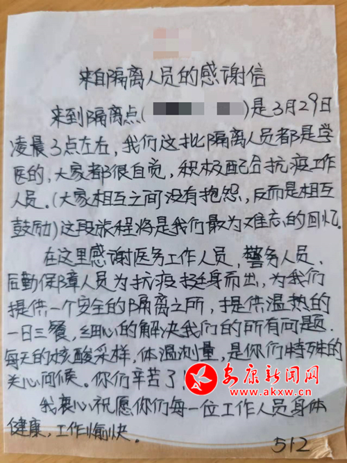 “感謝醫(yī)務(wù)人員、警務(wù)人員、后勤保障人員為抗疫挺身而出,為我們提供一個(gè)安全的隔離之所……你們辛苦了!”這是4月6日張灘鎮(zhèn)隔離點(diǎn)抗疫工作人員收到的一封感謝信,百余字言短意真,飽含著被隔離群眾滿滿的敬意與感謝。
