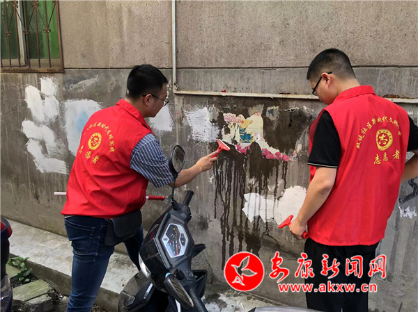 活動中,志愿者分為四組在轄區(qū)主街道及背街小巷清理野廣告和衛(wèi)生死角、整治車輛亂停亂放和占道經(jīng)營、夯實“門前四包”。