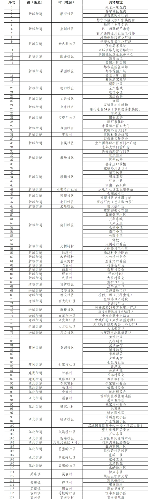 共設(shè)置117個采樣點(見附件),由各街道、鎮(zhèn)政府統(tǒng)一安排采樣點設(shè)置、人員組織、秩序維護(hù)。檢測對象按照街道和鎮(zhèn)政府要求,分時段有序到指定地點進(jìn)行采樣,避免人員聚集。