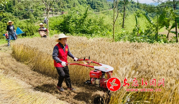 麥收時節(jié),漢濱區(qū)出現(xiàn)連續(xù)降雨,而成熟的麥穗最怕雨水,一旦遇上幾天連陰雨,金黃的麥穗很快就會發(fā)霉發(fā)黑長芽。為了做好搶收作業(yè),紅花村駐村工作隊協(xié)調(diào)了三臺半機械化農(nóng)機調(diào)運到了現(xiàn)場,紅花村第一書記現(xiàn)場指導農(nóng)機使用。鎮(zhèn)村志愿服務小隊戴著草帽、手拿鐮刀也到達了搶收現(xiàn)場,已經(jīng)在幫忙收割了。