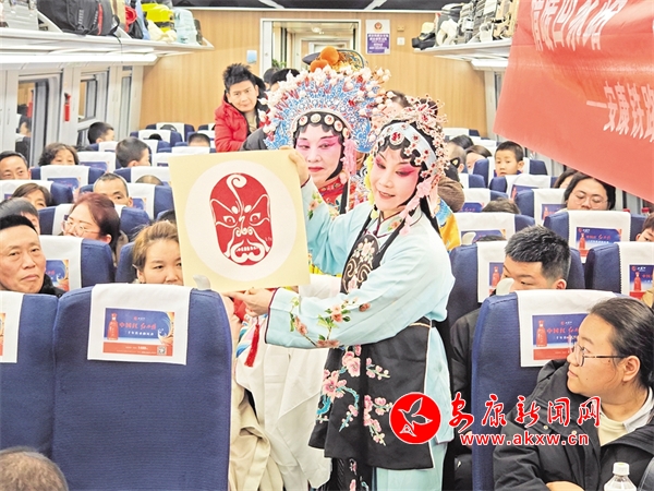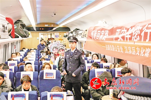 火車穿越秦巴山水間,途中,來自安康漢調(diào)二黃研究院的專業(yè)演員和地方民間漢調(diào)二黃愛好者們一同表演了國家級非物質(zhì)文化遺產(chǎn)——漢調(diào)二黃經(jīng)典戲曲演唱,并為旅客們講解漢調(diào)二黃戲曲知識,與旅客們開展互動(dòng)交流,讓旅客親身體驗(yàn)漢調(diào)二黃戲服道具,感受漢調(diào)二黃的獨(dú)特藝術(shù)魅力。來自漢濱區(qū)文化館的漢濱剪紙技藝傳承人為旅客們展示講解了安康市級非物質(zhì)文化遺產(chǎn)——漢濱剪紙技藝,向參與互動(dòng)的旅客送上了親手創(chuàng)作的漢濱剪紙作品,提前送上新春祝福;顒(dòng)中,西安鐵路公安局安康公安處的民警們和文藝工作者們一同宣傳普及了反詐知識,進(jìn)一步提升旅客的安全防范意識。