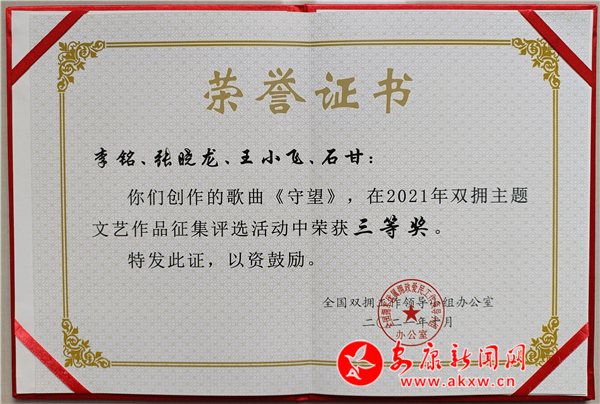 本網(wǎng)訊(通訊員 歐定揚)漢陰縣文旅廣電局文化干部李銘與其戰(zhàn)友創(chuàng)作的歌曲《守望》榮獲2021年度全國雙擁主題歌曲征集三等獎,據(jù)了解,這也是近幾年來漢陰縣在雙擁和文化宣傳工作上所獲得的又一獎項。