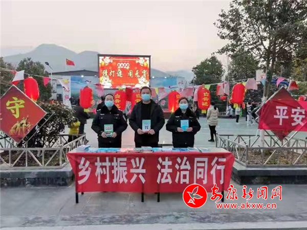 按傳統(tǒng)習(xí)俗,過完元宵佳節(jié)年就過完了,外出務(wù)工返鄉(xiāng)的群眾將會(huì)開啟新一年的務(wù)工歷程。該鎮(zhèn)抓住三元村鄉(xiāng)村文化理事會(huì)組織的元宵燈謎晚會(huì)活動(dòng)的有利時(shí)機(jī),在戲曲開場(chǎng)前,登臺(tái)向群眾宣傳《民法典》、《法律援助法》、《家庭教育促進(jìn)法》;設(shè)立宣傳臺(tái),把《民法典》、《農(nóng)村法律實(shí)用手冊(cè)》、平安建設(shè)、掃黑除惡、全民反詐等宣傳資料發(fā)送到群眾手中;對(duì)前來咨詢的群眾耐心解答群眾疑惑。該次普法宣傳,共計(jì)開展普法宣講一次,發(fā)放宣傳資料300余份,解答群眾咨詢6人次。