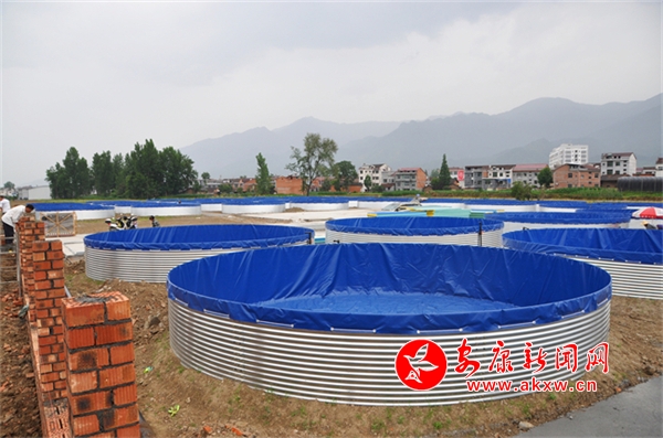 在項(xiàng)目建設(shè)現(xiàn)場,60個直徑8米高1.5米的圓形水池已經(jīng)建好,一個個用鐵皮圍成的藍(lán)色圓桶很是顯眼。“這種水池外圈都是由不銹鋼圍成的,里面是用藍(lán)色防水布包裹。”劉光興指著水池說:“這個鄉(xiāng)村振興項(xiàng)目是陸基圓桶型高位養(yǎng)魚池,主要利用洞河水庫庫區(qū)下游優(yōu)質(zhì)水資源來養(yǎng)殖匙吻鱘、黃辣丁、鱸魚等中高端暢銷品種。采取的是循環(huán)水養(yǎng)魚新模式,優(yōu)勢是流水養(yǎng)魚、品質(zhì)好,還減少了人力和養(yǎng)殖成本,提高科學(xué)化管理水平。6月底前,就能建成使用。”