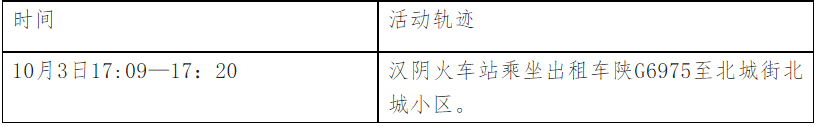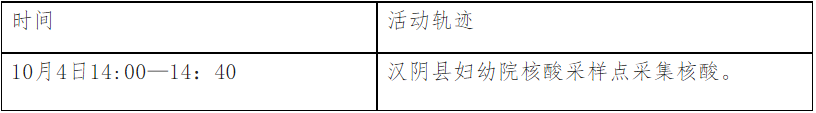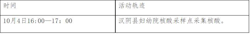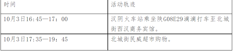 根據(jù)流調(diào)情況,現(xiàn)將漢中一例初篩陽性病例涉及密切接觸者在漢陰縣公共場所活動(dòng)軌跡公布如下: