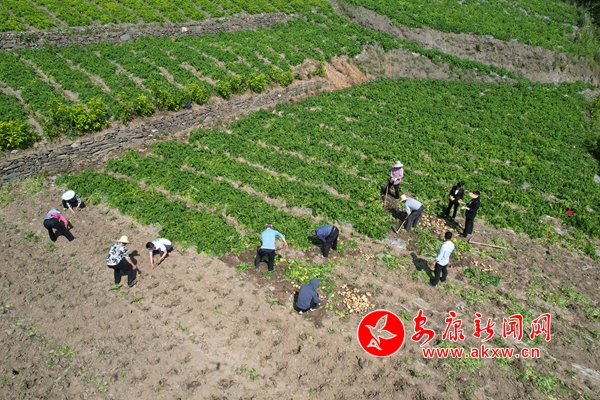 “大家加把勁兒,惠康源公司今天下午要2000斤土豆。”在漢陰縣雙河口鎮(zhèn)黃龍村的土豆種植基地里,駐村第一書記唐建安一邊忙著和村民一起采收土豆,一邊督促進度。十余位村民分工有序,忙而不亂,隨著鋤頭的揮舞,一顆顆外觀飽滿、個頭勻稱的土豆破土而出,分揀、裝袋……田地里每個人的臉上都掛滿了豐收的喜悅。