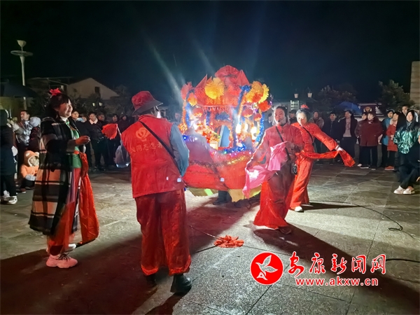 在位于漢陰縣平梁鎮(zhèn)的興隆佳苑社區(qū),春節(jié)期間,小區(qū)里處處洋溢著節(jié)日氛圍。夜幕降臨,社區(qū)廣場響起陣陣鑼鼓聲,;ù硌菡介_始。只見表演者雙手提船、配合默契,船體隨著“波浪”旋轉(zhuǎn)、顛簸,身穿喜慶艷麗的服裝、頭戴五彩頭飾的表演人員個個精神抖擻,一邊前行,一邊唱著漢陰本地的花鼓戲,祈求來年風(fēng)調(diào)雨順、福壽安康。翻飛的彩扇、華麗的彩船,精心編排、詼諧幽默的表演,為社區(qū)群眾呈現(xiàn)了一場精彩的視覺盛宴。