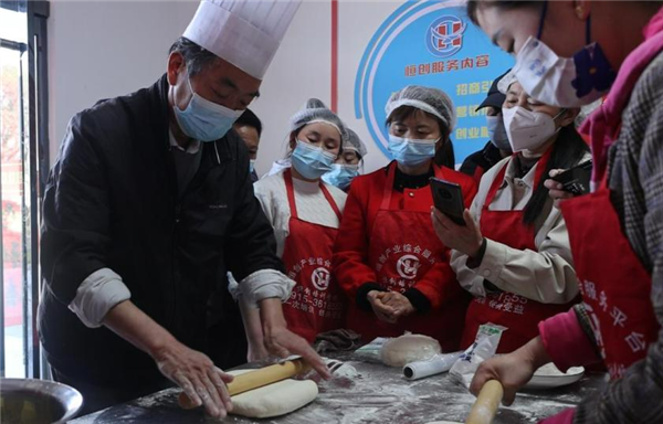 △學(xué)員們跟著師傅認真學(xué)習(xí)面點技能