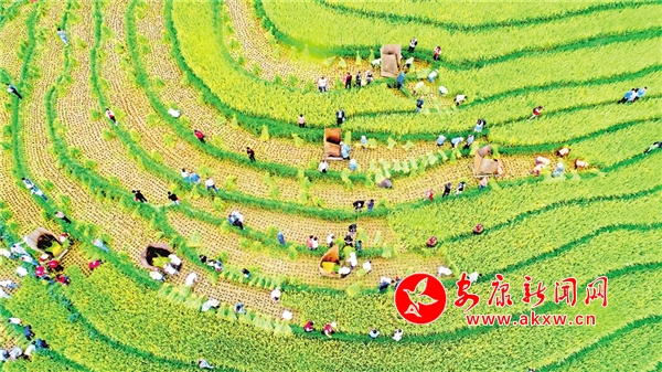 從空中俯瞰,桂花村近千畝梯田形似一塊袈裟,稻谷豐收時(shí),躍入眼簾的金色稻浪成為這個(gè)季節(jié)最美的風(fēng)景。