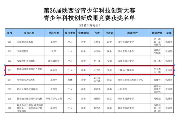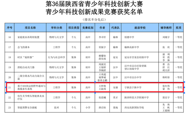 據(jù)悉,陜西省第36屆青少年科技創(chuàng)新大賽由省科協(xié)、團(tuán)省委、省婦聯(lián)共同主辦。大賽分青少年科技創(chuàng)新成果競(jìng)賽、科技輔導(dǎo)員創(chuàng)新成果競(jìng)賽、青少年科技實(shí)踐活動(dòng)、青少年科技創(chuàng)意比賽、少年兒童科學(xué)幻想繪畫(huà)比賽等五個(gè)類別。全省高中組青少年科技創(chuàng)新成果競(jìng)賽共評(píng)出108個(gè)獎(jiǎng)項(xiàng),其中一等獎(jiǎng)9項(xiàng),被推薦參加全國(guó)大賽僅7項(xiàng)。我校兩名學(xué)生的科技創(chuàng)新項(xiàng)目榮獲一等獎(jiǎng),并拿到參加全國(guó)大賽通行證實(shí)屬不易,彰顯了學(xué)校科技創(chuàng)新特色發(fā)展的強(qiáng)大實(shí)力。