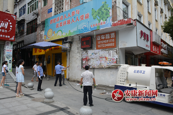 7.1前夕,縣住建局、城管大隊(duì)聯(lián)合環(huán)衛(wèi)所組織全體執(zhí)法人員走上街頭并出動(dòng)灑水車,強(qiáng)力清污車對全城人行道、天橋、沿街的“牛皮癬”進(jìn)行清理,規(guī)范市場及占道經(jīng)營,以此拉開了“百日整治”的序幕。