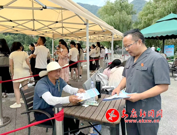 在各大景區(qū),法官干警給旅游景區(qū)的工作人員講解相關(guān)法律知識、教他們?nèi)绾我婪皶r處理與游客之間的矛盾糾紛,確保一旦發(fā)生旅游糾紛,第一時間有人報告、第一時間有人接待、第一時間有人解決。向來往游客和景區(qū)工作人員發(fā)放旅游法宣傳手冊,對游客較為關(guān)注的“旅游者的權(quán)利、旅行社的義務(wù)、旅游安全如何保障、旅游糾紛如何解決”等進行詳細解答,并向游客積極熱情解答各類法律咨詢。