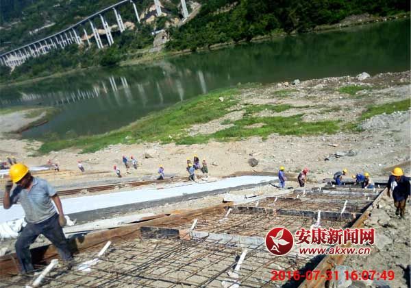 晏溝料場(chǎng)是旬陽(yáng)水電站工程建設(shè)砂石料篩分基地,近30余萬方的渣土堆砌在漢江右岸,正值漢江主汛期,一旦遭遇漢江洪水,后果不堪設(shè)想,解決料場(chǎng)的防洪安全是保障水電站工程建設(shè)的關(guān)鍵。當(dāng)?shù)卣徒ㄔO(shè)單位精心組織,拼搶施工,重點(diǎn)對(duì)臨江200余米長(zhǎng)、40余米高的料場(chǎng)截面采用混泥土面板防護(hù)工程措施,經(jīng)過一周時(shí)間的連續(xù)奮戰(zhàn),提前4天順利完成江岸料場(chǎng)防護(hù)工程節(jié)點(diǎn)任務(wù)。