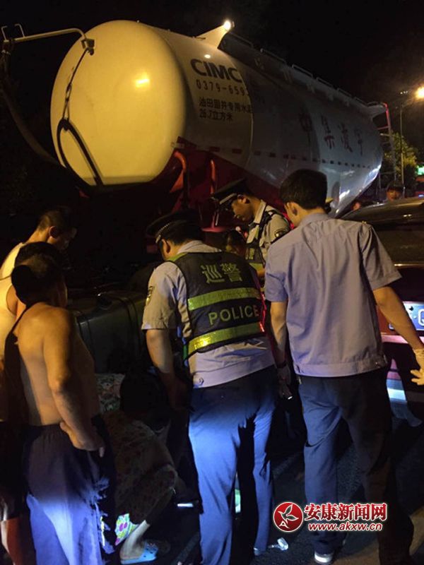 7月21日晚23時許,旬陽縣公安局巡警大隊康華園巡邏民警接到過路的群眾報警,稱:城區(qū)周家溝附近有交通事故,可能有人受傷。民警立即趕往事發(fā)地點,沿途發(fā)現(xiàn)交通以堵塞,長長的車隊一眼望不到頭,趕到事發(fā)地點后,發(fā)現(xiàn)一油罐車車底躺著兩個人,一男一女系夫妻關系,女子的腿部受傷嚴重,不能移動,當民警趕到現(xiàn)場后,交警以及救護車隨后趕到,巡邏民警配合救護人員將躺在油罐車下的兩人救出,及時送往醫(yī)院救治。