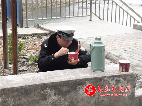 和她一樣的女漢子還有活躍在縣醫(yī)院十字路口處的王金、向婷,站在崗位上一刻她們就要圓滿完成這一刻的任務(wù)。疏導(dǎo)行人和車輛,確保縣醫(yī)院應(yīng)急通道的暢通,在她們心里那就是天職,連吃飯也一直在附近移動(dòng)警務(wù)車?yán)镙喠骰鹚俳鉀Q。