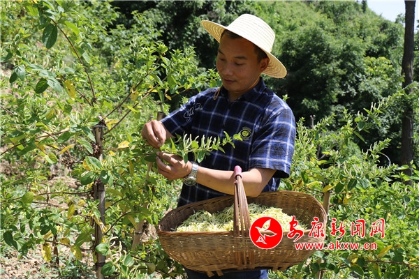 本網(wǎng)訊(通訊員 華榮艷)遍地皆春同時伴著收獲與播種的五月,走進構(gòu)元鎮(zhèn)林相村的金銀花種植基地里正是“花發(fā)金銀滿架香”。漫山遍野的金銀花枝繁葉茂,一簇簇黃白相間的金銀花散發(fā)著縷縷清香,一群正忙著采摘今年第一茬花的村民們,滲著汗珠的臉上洋溢著喜悅的笑容。