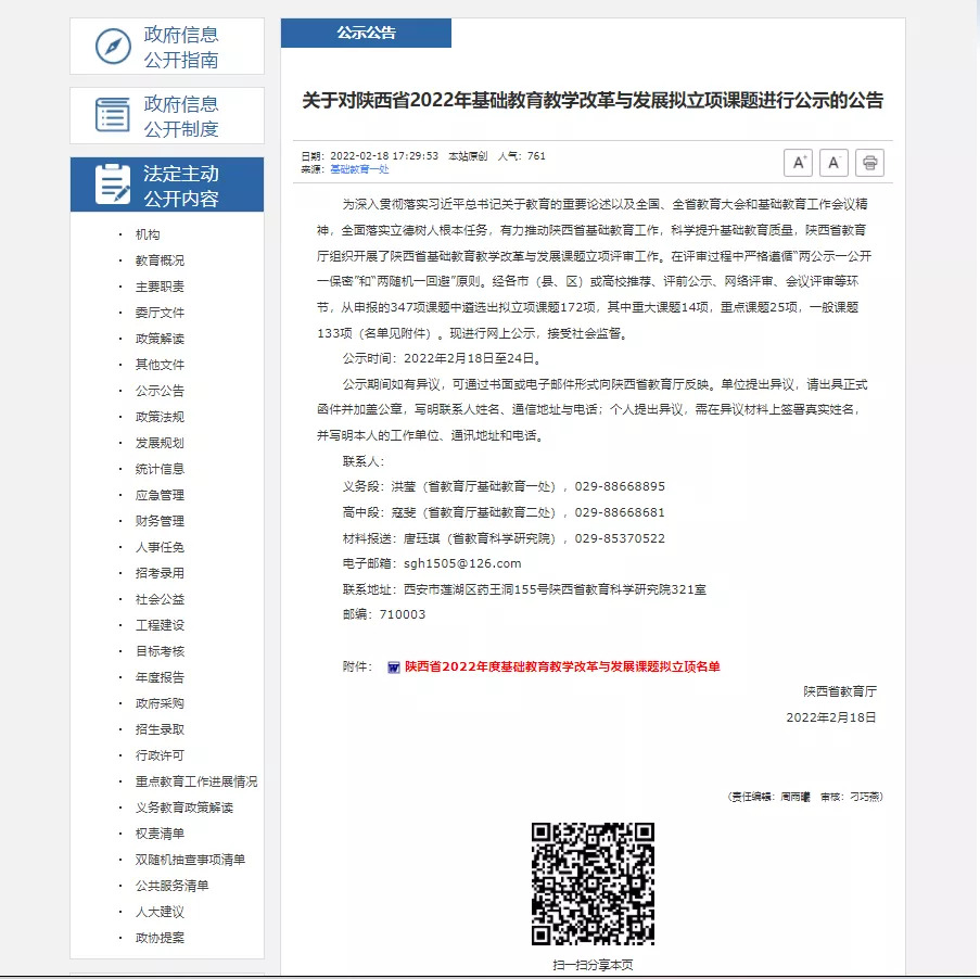 為了深入貫徹落實(shí)習(xí)近平總書記關(guān)于教育的重要論述以及全國、全省教育大會和基礎(chǔ)教育工作會議精神,全面落實(shí)立德樹人根本任務(wù),大力推動陜西省基礎(chǔ)教育工作,科學(xué)提升基礎(chǔ)教育質(zhì)量,陜西省教育廳組織此次課題的評審和立項工作。本次立項課題172項,是從申報的347項課題中遴選而出的。