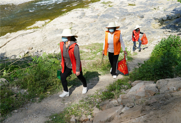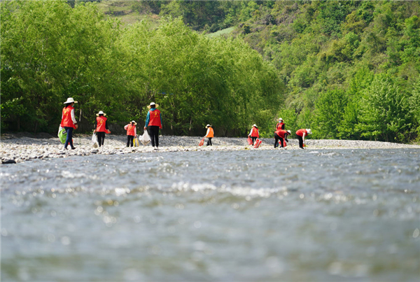 4月10日,在陜西旬陽(yáng)市雙河鎮(zhèn)高坪社區(qū)河道旁,女子志愿護(hù)河隊(duì)隊(duì)員撿拾完垃圾后離開(kāi)。 新華社記者 邵瑞 攝