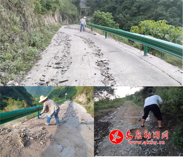 6月下旬,一場暴雨來襲,緩解旱情的同時,又將三組陽在梁(小地名)的通組主干道沖擊損毀,這不僅使三組村民出行困難,更是阻斷了金銀花外銷的交通道路。得知這一情況后,市司法局駐村工作隊和村“兩委”立即組織公益崗對道路進行自救修復(fù)。