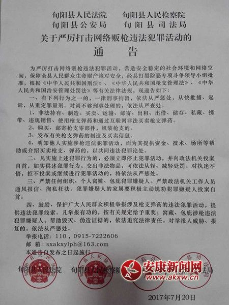 安康新聞網(wǎng)訊(通訊員 ?担7月20日,旬陽警方聯(lián)合法、檢、司部門共同發(fā)布了《關(guān)于嚴(yán)厲打擊網(wǎng)絡(luò)販槍違法犯罪活動的通告》。從該縣警方了解到,發(fā)布此次《通告》……
